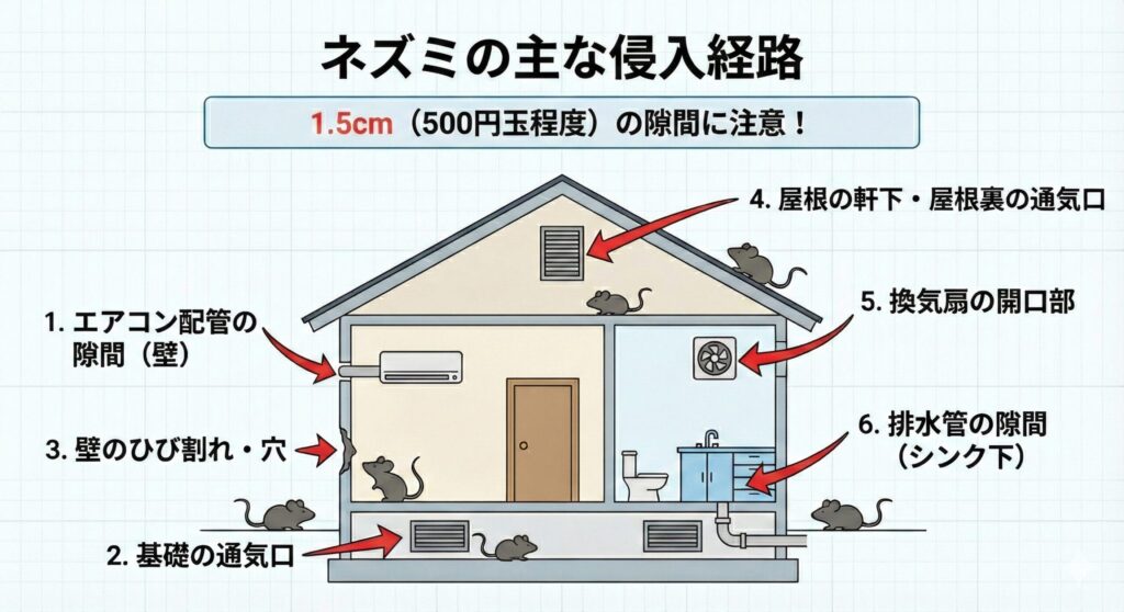 - これが最大の盲点です。ネズミは1.5cm(500円玉より小さい)の隙間があれば通り抜けます。エアコンの配管の隙間、通風口、基礎のひび割れなどが入り口になります。